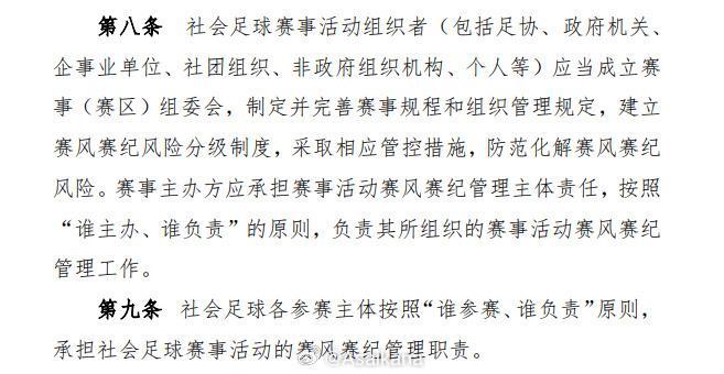 此前,中国足协正式印发《中国足球协会社会足球赛事活动赛风赛纪管理办法(试行)》,其中强调“主办跨区域社会足球赛事的会员单位,需履行事前报备程序”。